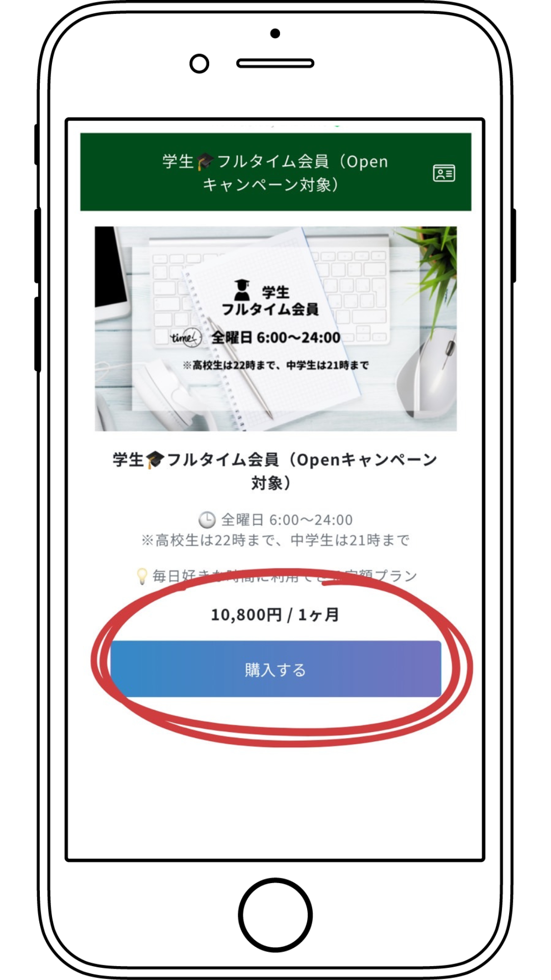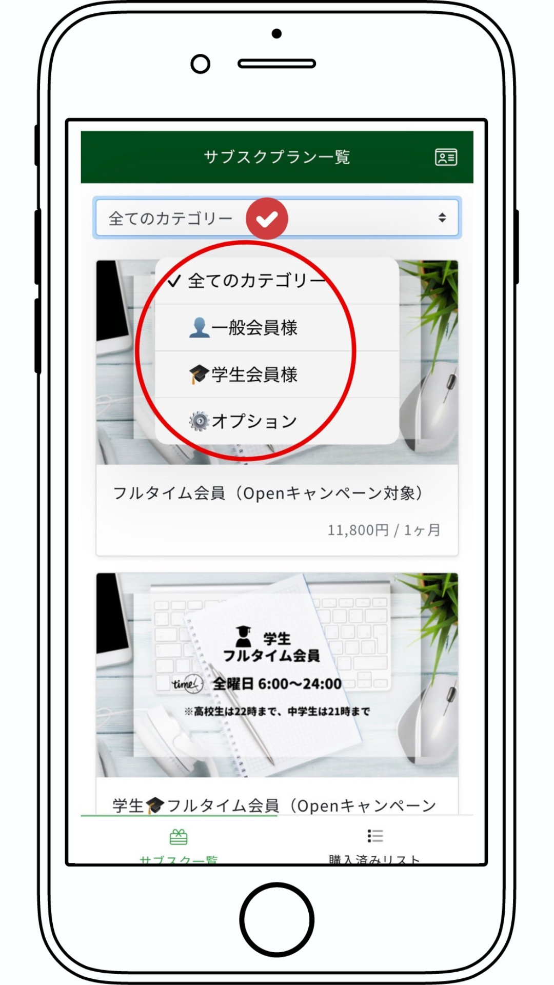 カテゴリー一覧から、ご希望の「一般会員様」「学生会員様」「オプション」を選んでタップ